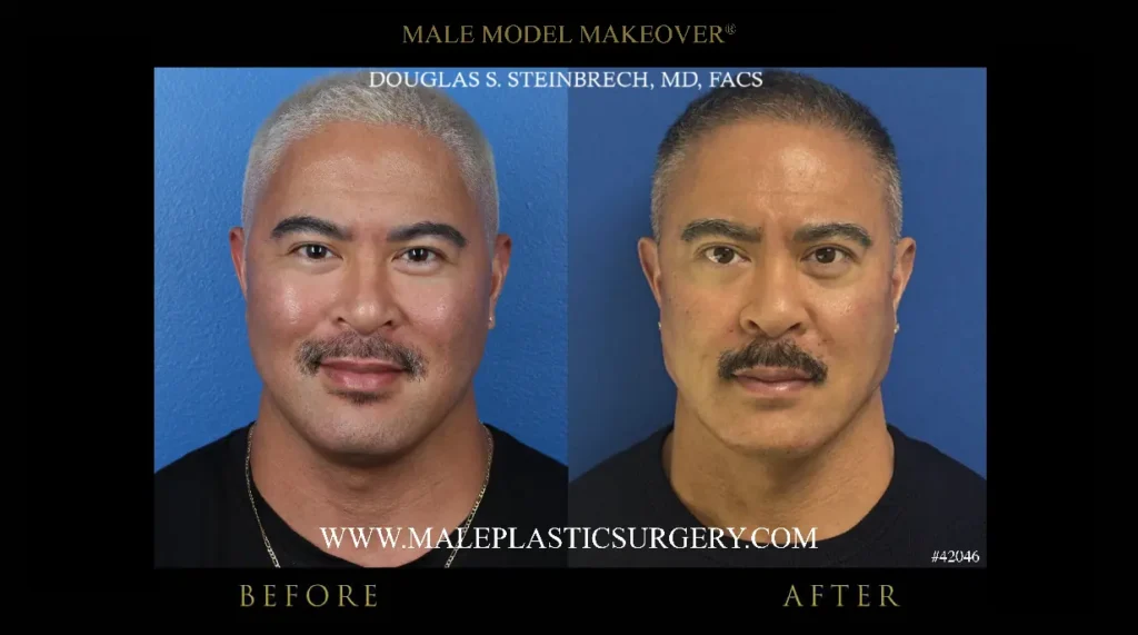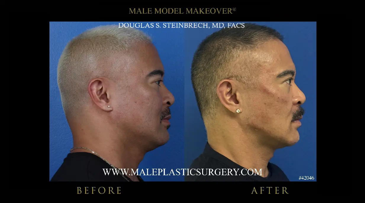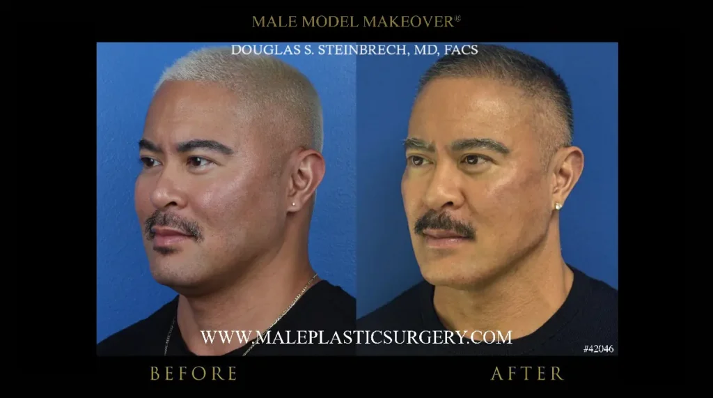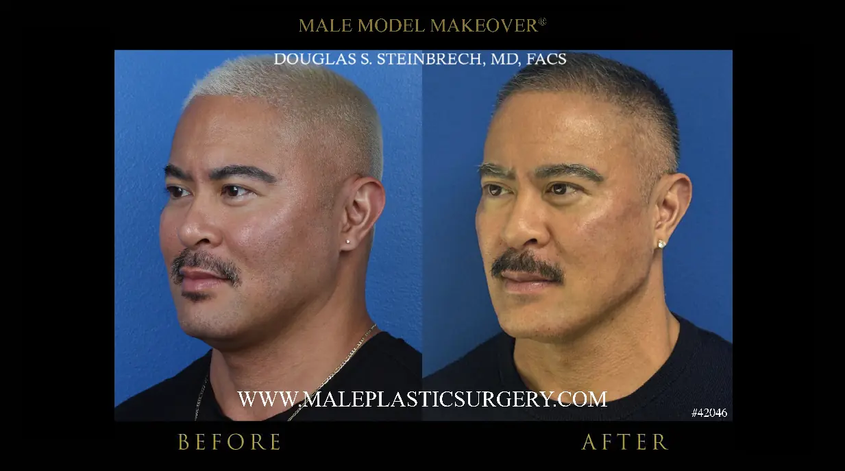 Dr. Douglas Steinbrech performs this procedure for his male patients using facial dermal fillers and injectable cosmetics (Botox). Please click on each thumbnail to enlarge it to full size.
